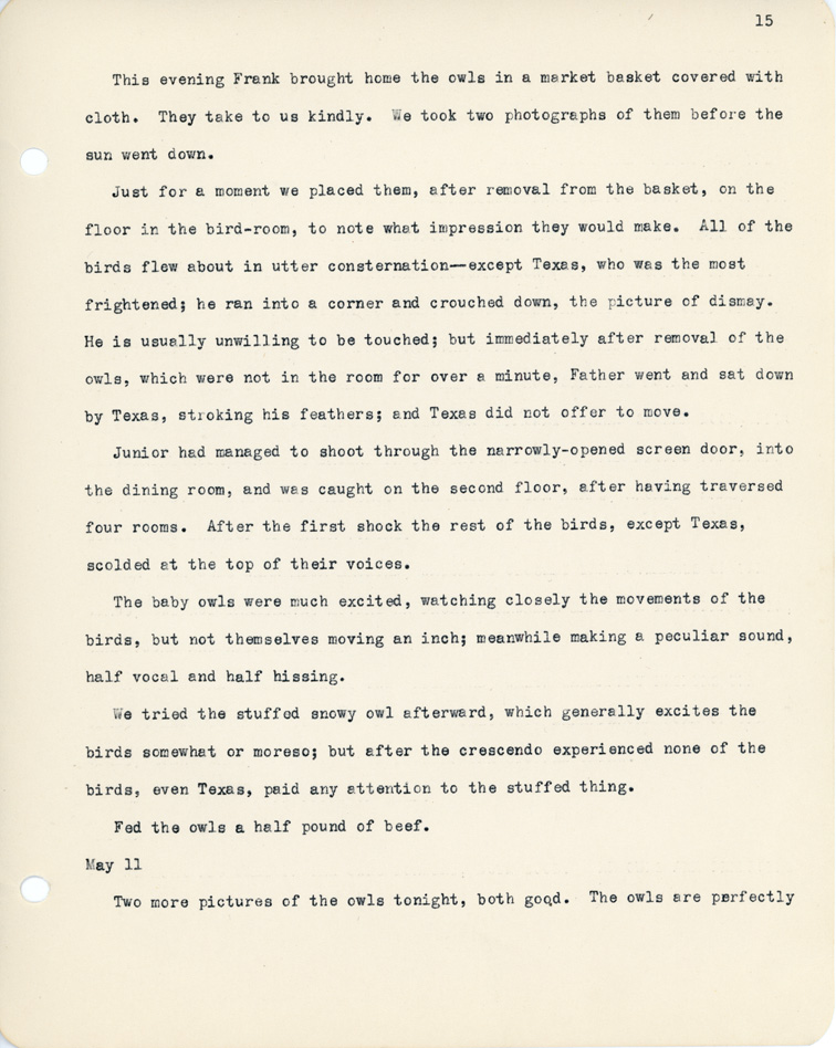 15 This evening Frank brought home the owls in a market basket covered with cloth. They take to us kindly. We took two photographs of them before the sun went down. Just for a moment we placed them, after removal from the basket, on the floor in the bird-room, to note what impression they would make. All of the birds flew about in utter consternation-except Texas, who was the most frightened; he ran into a corner and crouched down, the picture of dismay. He is usually unwilling to be touched; but immediately after removal of the owls, which were not in the room for over a minute, Father went and sat down by Texas, stroking his feathers; and Texas did not offer to move. Junior had managed to shoot through the narrowly-opened screen door, into the dining room, and was caught on the second floor, after having traversed four rooms. After the first shock the rest of the birds, except Texas, scolded at the top of their voices. The baby owls were much excited, watching closely the movements of the birds, but not themselves moving an inch; meanwhile making a peculiar sound, half vocal and half hissing. We tried the stuffed snowy owl afterward, which generally excites the birds somehwat or moreso; but after the crescendo experienced none of the birds, even Texas, paid any attention to the stuffed thing. Fed the owls a half pound of beef. May 11 Two more pictures of the owls tonight, both good. The owls are perfectly