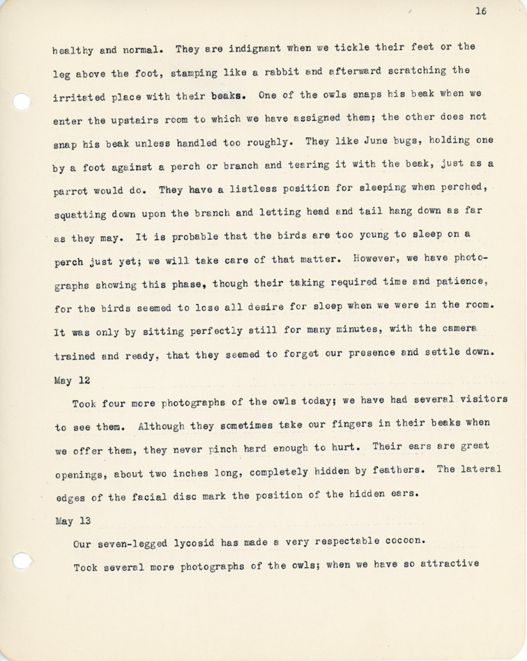 16 healthy and normal. They are indignant when we tickle their feet or the leg above the foot, stamping like a rabbit and afterward scratching the irritated place with their beaks. One of the owls snaps his beak when we enter the upstairs room to which we have assigned them; the other does not snap his beak unless handled too roughly. They like June bugs, holding one by a foot against a perch or branch and tearing it with the beak, just as a parrot would do. They have a listless position for sleeping when perched, squatting down upon the branch and letting head and tail hang down as far as they may. It is probable that the birds are too young to sleep on a perch just yet; we will take care of that matter. However, we have photographs showing this phase, though their taking required time and patience, for the birds seemed to lose all desire for sleep when we were in the room. It was only by sitting perfectly still for many minutes, with the camera trained and ready, that they seemed to forget our presence and settle down. May 12 Took four more photographs of the owls today; we have had several visitors to see them. Although they sometimes take our fingers in their beaks when we offer them, they never pinch hard enough to hurt. Their ears are great openings, about two inches long, completely hidden by feathers. The lateral edges of the facial disc mark the position of the hidden ears. May 13 Our seven-legged lycosid has made a very respectable cocoon. Took several more photographs of the owls; when we have so attractive