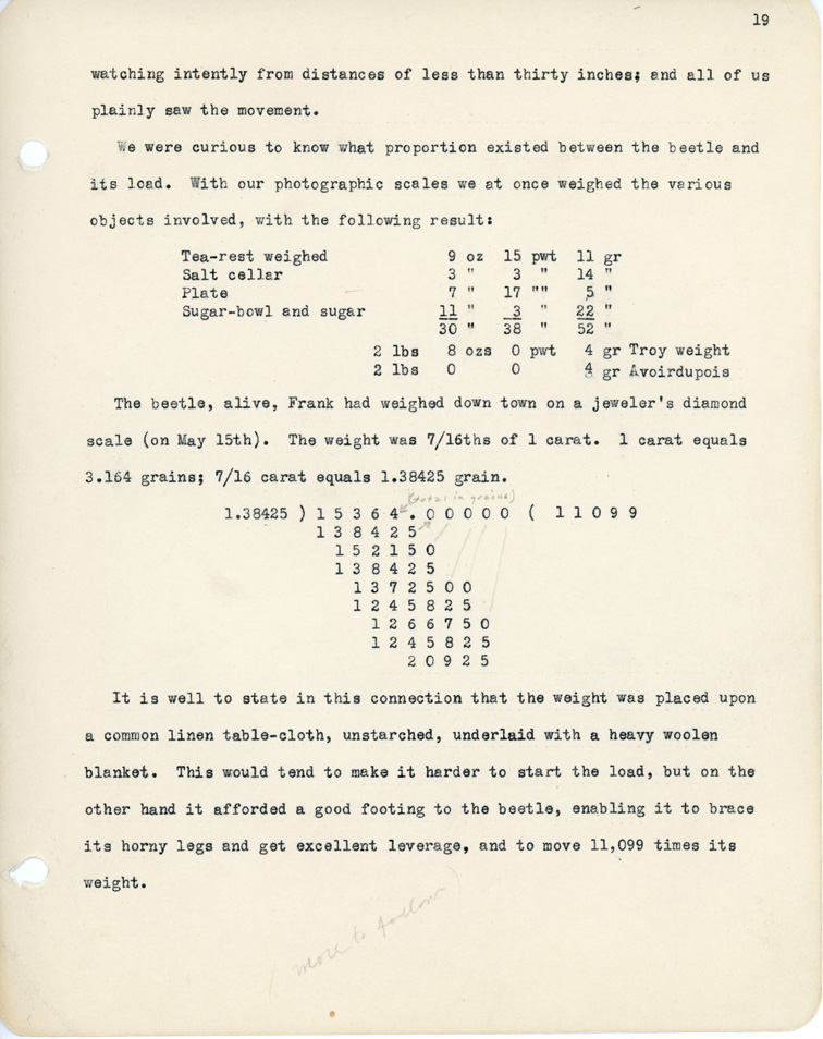 19 watching intently from distances of less than thirty inches; and all of us plainly saw the movement. We were curious to know what proportion existed between the beetle and its load. With our photographic scales we at once weighed the various objects involved, with the following result: Tea-rest weighed 9oz 15pwt 11gr Salt cellar 3" 3" 14" Plate 7" 17" 5" Sugar-bowl and sugar 11" 3" 22" 30" 38" 52" 2lbs 8ozs 0pwt 4gr Troy weight 2lbs 0 0 4gr Avoirdupois The beetle, alive, Frank had weighed down town on a jeweler's diamond scale (on May 15th). The weight was 7/16ths of 1 carat. 1 carat equals 3.164 grains; 7/16 carat equals 1.38425 grain. 1.38425 ) 1 5 3 6 4 . 0 0 0 0 0 ( 1 1 0 9 9 1 3 8 4 2 5 1 5 2 1 5 0 1 3 8 4 2 5 1 3 7 2 5 0 0 1 2 4 5 8 2 5 1 2 6 6 7 5 0 1 2 4 5 8 2 5 2 0 9 2 5 It is well to state in this connection that the weight was placed upon a common linen table-cloth, unstarched, underlaid with a heavy woolen blanket. This would tend to make it harder to start the load, but on the other hand it afforded a good footing to the beetle, enabling it to brace its horny legs and gets excellent leverage, and to move 11,099 times its weight.