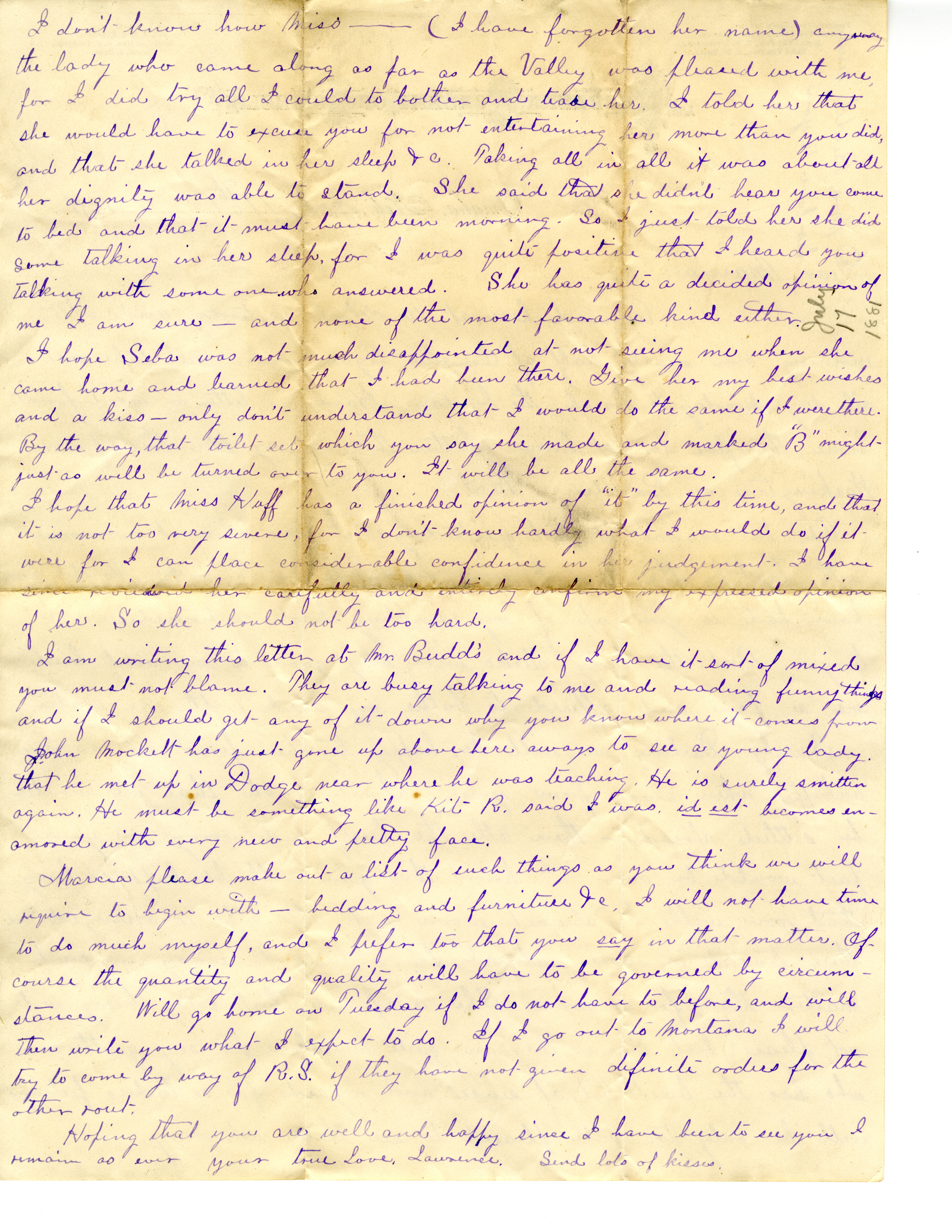 I am writing this letter at Mr. Budd's and if I have it sort of mixed you must not blame. They are busy talking to me and reading funny things and if I should get any of it down why you know where it comes from. John Mockelt has just gone up above here aways to see a young lady that he met up in Dodge near where he was teaching. He is surely smitten again. He must be something like Kit R. said I was, id est becomes enamored with every new and pretty face.