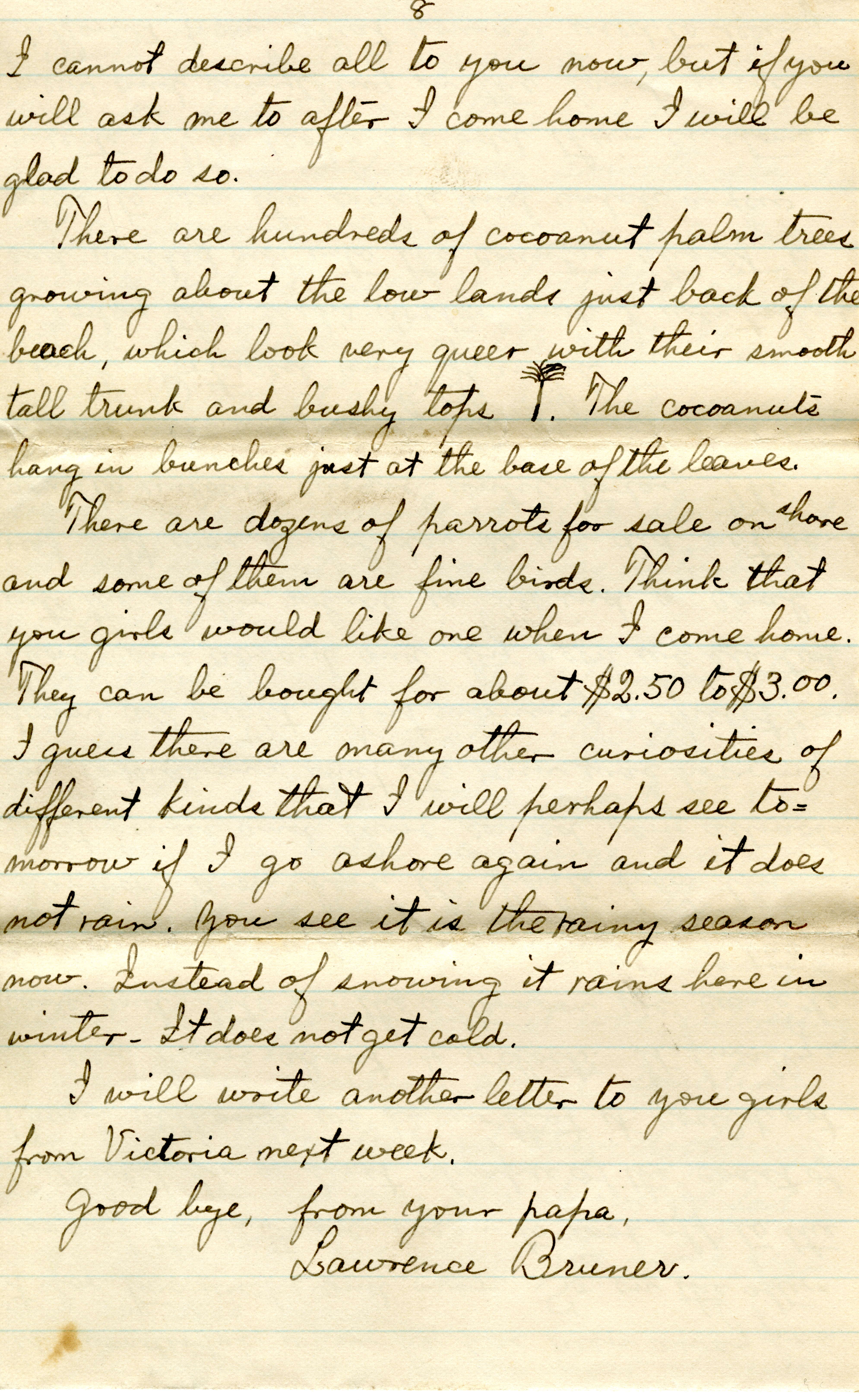 There are dozens of parrots for sale on shore and some of them are fine birds. Think that you girls would like one when I come home. They can be bought for about $2.50 to $3.00. I guess there are many other curiousities of different kinds that I will perhaps see tomorrow if I go ashore again and it does not rain. You see it is the rainy season now. Instead of snowing it rains here in winter. It does not get cold.