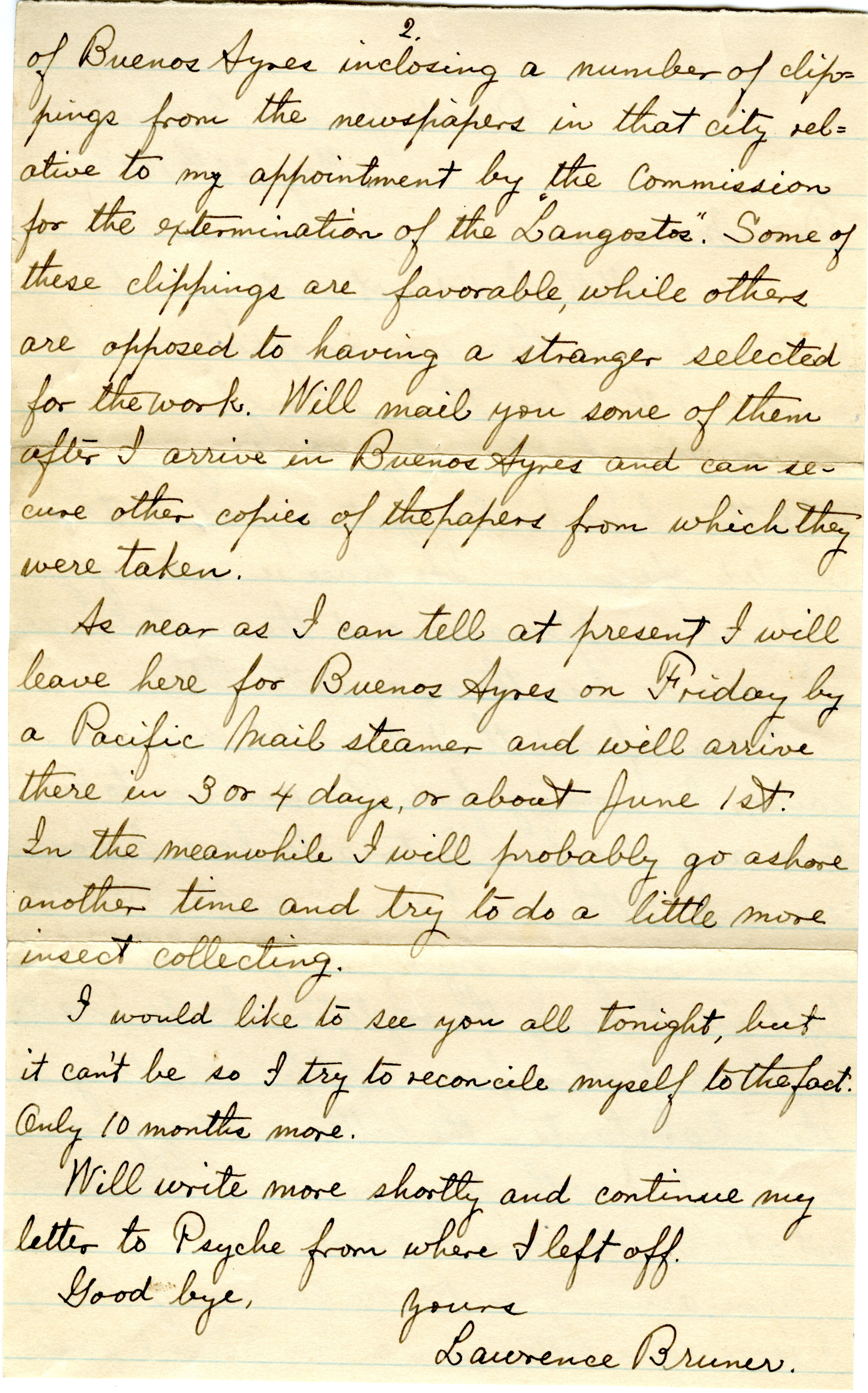 As near as I can tell at present I will leave here for Buenos Ayres on Friday by a Pacific Mail steamer and will arrive there in 3 or 4 days, or about June 1st. In the meanwhile I will probably go ashore another time and try to do a little more insect collecting.
