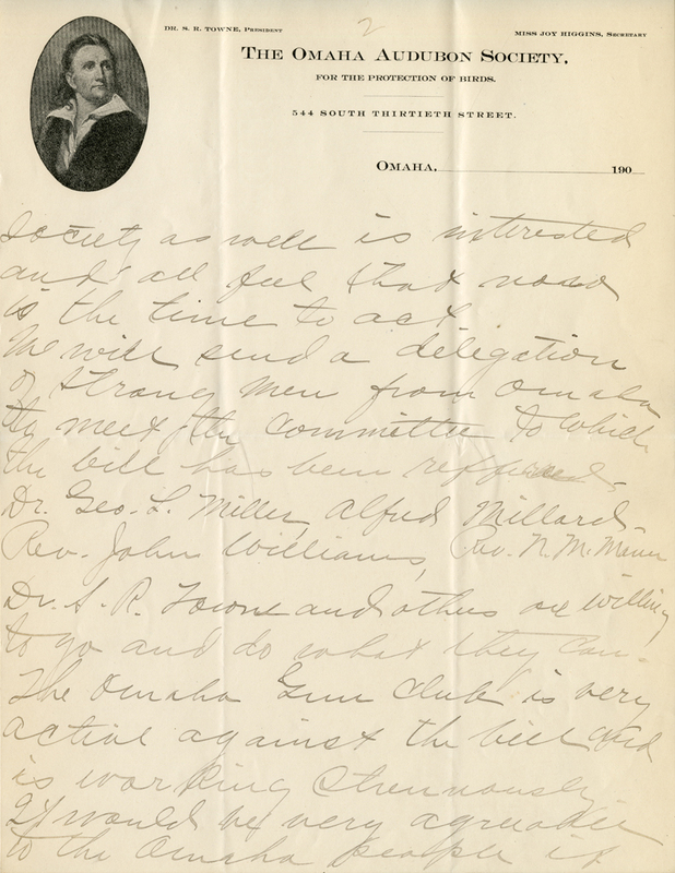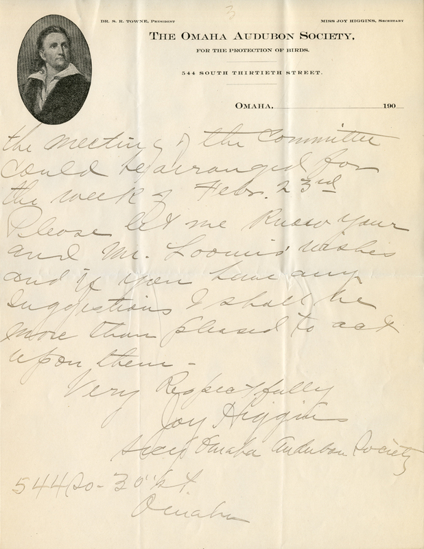 the meeting of the committee could be arranged for the week of Febr. 23rd Please let me know your and Mr. Loomis' wishes and if you have any suggrestions I shall be more than pleased to act upon them. Very Respectfully Joy Higgins Secy Omaha Audubon Society 544 So. 30th St. Omaha