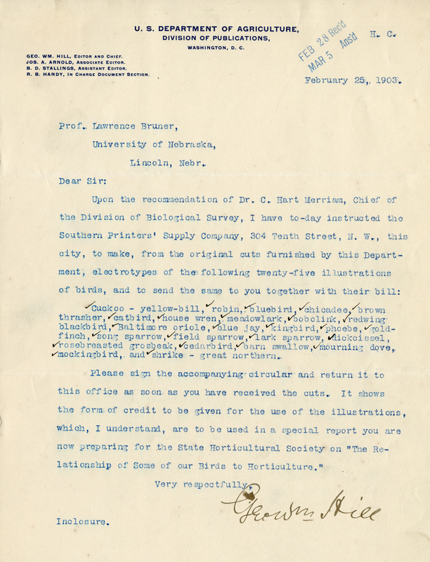 Please sign the accompanying circular and return it to this office as soon as you have received the cuts. It shows the form of credit to be given for the use of the illustrations, which, I understand, are to be used in a special report you are now preparing for the State Horticultural Society on "The Relationship of Some of our Birds to Horticulture."