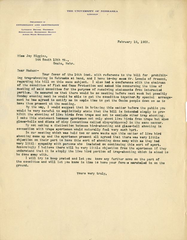 Your favor of the 14th inst. with reference to the bill for prohibiting trap-shooting in Nebraska at hand, and I have to-day seen Mr. Loomis of Fremont, regarding his bill on this same subject. I also had a conference with the chairman of the committee of Fish and Game Protection and asked him concerning the time of meeting of said committee for the purpose of receiving statements from interested parties. He assured me that there would be no meeting before next week but possibly Monday evening next he would be able to get the committee together. By special arrangement he has agreed to notify me in ample time to get the Omaha people down so as to have them present at the meeting.