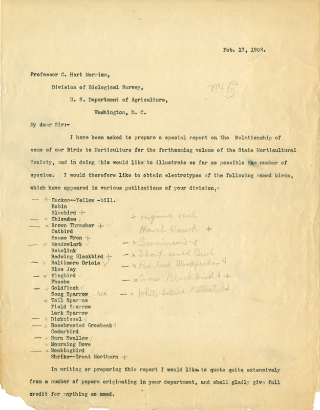 I have been asked to prepare a special report on the Relationship of some of our Birds to Horticulture for the forthcoming volume of the State Horticultural Society, and in doing this would like to illustrate so far as possible the number of species. I would therefore like to obtain electrotypes of the following named birds, which have appeared in various publications of your division.