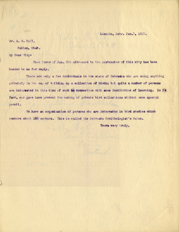 Nebraska Ornithologists’ Union, Letters, 1903, January