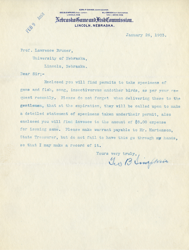 Enclosed you will find permits to take specimens of game and fish, song, insectivorous and other birds, as per your request recently. Please do not forget when delivering these to the gentlemen, that at the expiration, they will be called upon to make a detailed statement of specimens taken under their permit, also enclosed you will find invouce to the amount of $5.00 expense for issuing same. Please make warrant payable to Mr. Mortenson, State Treasurer, but do not fail to have this go through my hands, so that I may make a record of it.