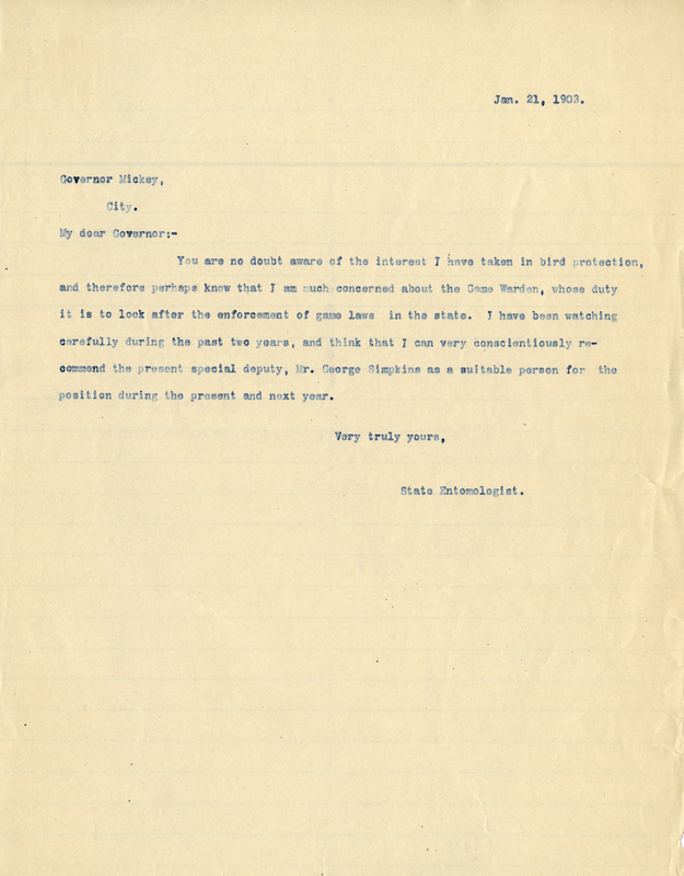 You are no doubt aware of the interest I have taken in bird protection, and therefore perhaps know that I am much concerned about the Game Warden, whose duty it is to look after the enforcement of game laws in the state. I have been watching carefully during the past two years, and think that I can very conscientiously recommend the present special deputy, Mr. George Simpkins as a suitable person for the position during the present and next year.
