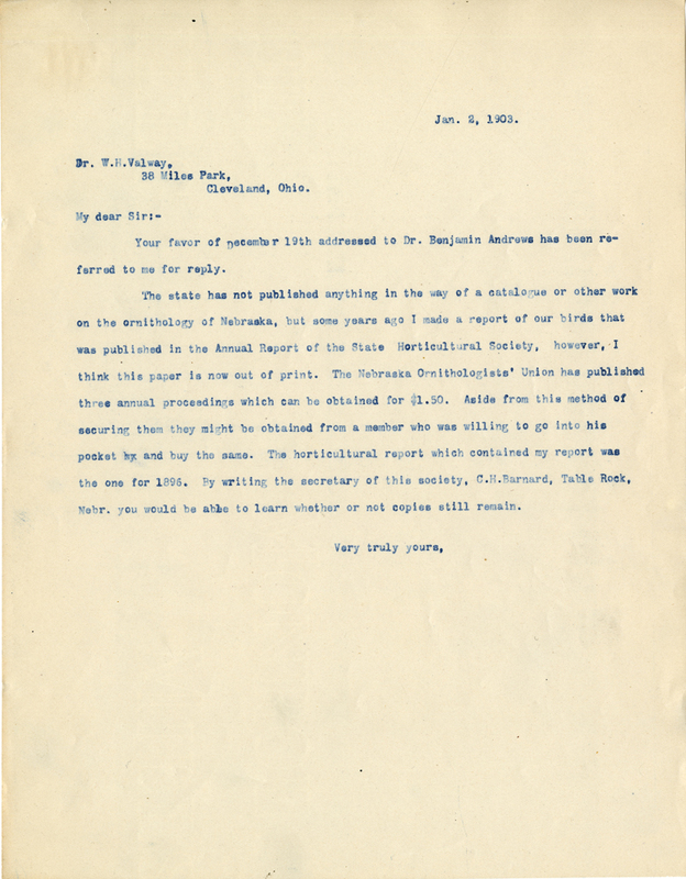 - Letter, Lawrence Bruner to W.H. Valway, Jan. 2, 1903
