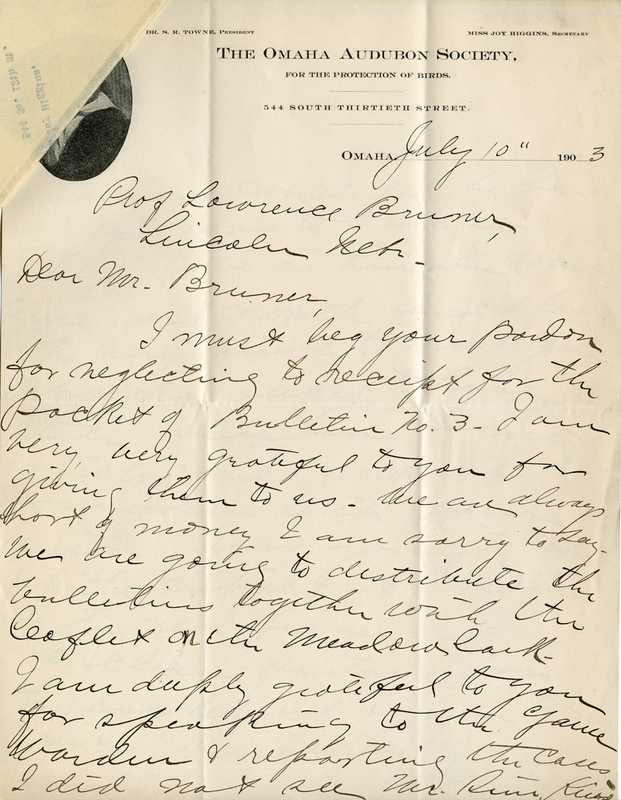 Nebraska Ornithologists’ Union, Letters, 1903, July