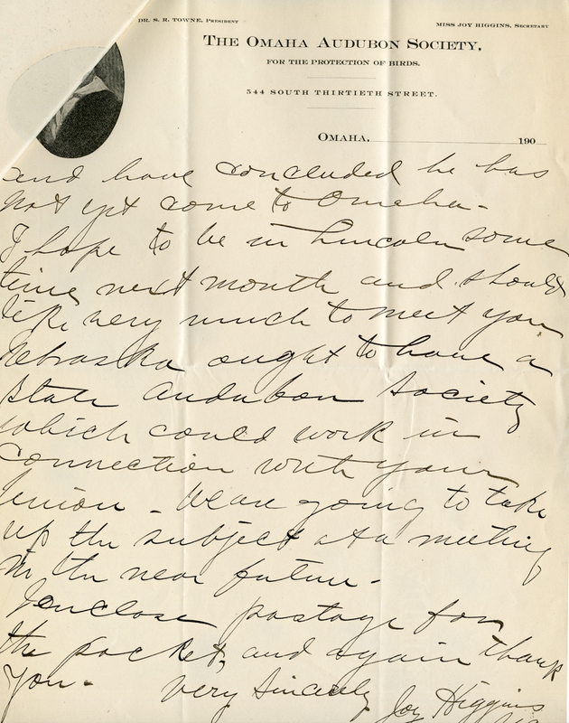 and have concluded he has not yet come to Omaha. I hope to be in Lincoln some time next month and should like very much to meet you. Nebraska ought to have a State Audubon Society which could work in connection with your Union. We are going to take up the subject at a meeting in the near future. I enclose postage for the packet, and again thank you. Very Sincerely, Joy Higgins