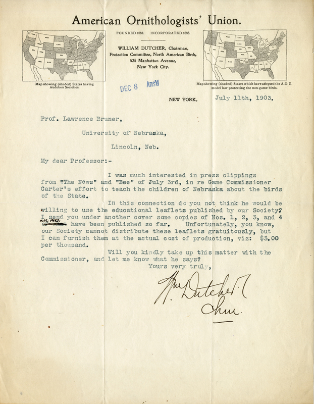 - Letter, William Dutcher to Lawrence Bruner, 1903, July 11