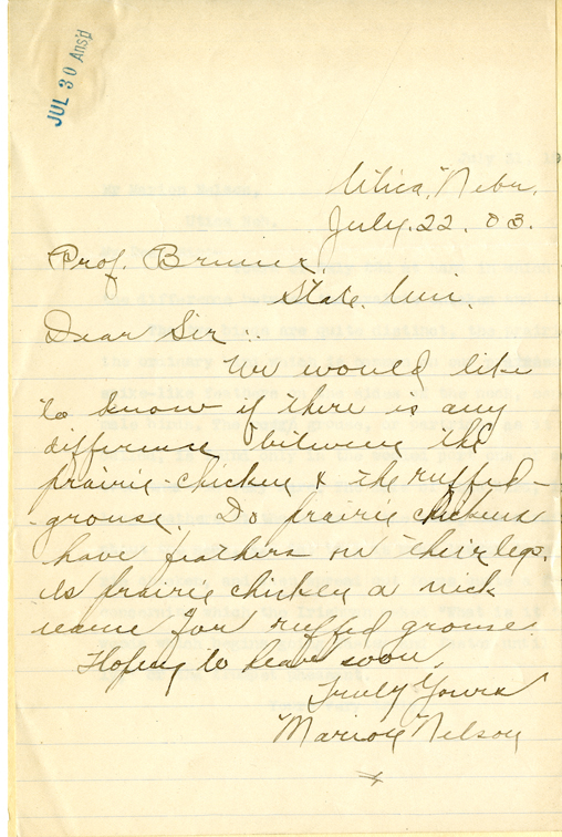 Yours of July 23 at hand in which you ask concerning the difference between the prairie chicken and the ruff/ grouse. The two birds are quite distinct, the prairie chicken being the ordinary bird which is common on our prairies, and which has spike-like feathers on the sides of the neck, especially of the male birds. The ruff/ grouse, or partridge as it is sometimes called, is found only in the wooded port ons of our state, and even there is very rare. The male of this bird, instead of having long feathers at the sides of the neck, has a ruff of long feathers about the neck, and the tail is much longer than that of the prairie chicken, and when spread out forms quite a fan. It is the bird concerning which the Irishman asked "What is it that you see in the woods which begins going faster and faster until it stops entirely," or the trumpet pheasant.