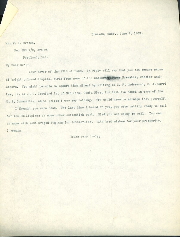 Your favor of the 29th at hand. In reply will say that you can secure skins of bright colored tropical birds from some of the eastern [illegible] Brewster, Webster and others. You might be able to secure them direct by writing to C. F. Underwood, M. A. Carriker, Jr. or J. C. Crawford Jr. of San Jose, Costa Rica, the last two named in care of the U. S. Consulate. As to prices I can say nothing. You would have to arrange that yourself. I thought you were dead. The last time I heard of you, you were getting ready to sail for the Phillipines or some other outlandish part. Glad you are doing so well. You can arrange with some Oregon bug man for butterflies. With best wishes for your prosperity, I remain,