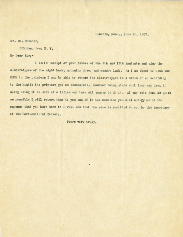 I am in receipt of your favors of the 9th and 13th instants and also the electrotypes of the night hawk, mourning dove, and meadow lark. As I am about to hand the MSS/ to the printers I may be able to return the electrotypes in a month or so according to the hustle the printers get on themselves. However being state work they may drag it along using it as sort of a filler and take all summer to do it. At any rate just as quick as possible I will return them to you and if in the meantime you will notify me of the expense that you have been to I will see that the same is remitted to you by the Secretary of the Horticultural Society.