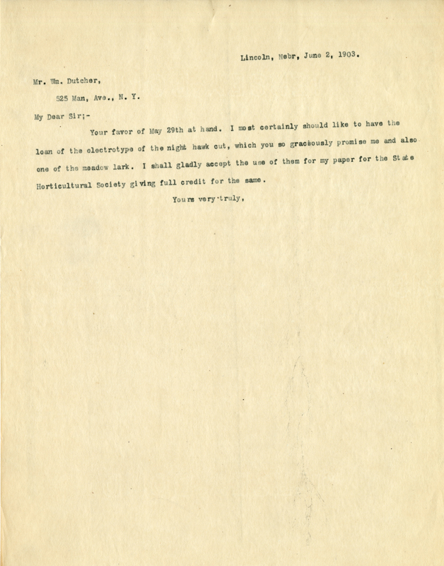 Your favor of May 29th at hand. I most certainly should like to have the loan of the electrotype of the night hawk cut, which you so graciously promise me and also one of the meadow lark. I shall gladly accept the use of them for my paper for the State Horticultural Society giving full credit for the same.
