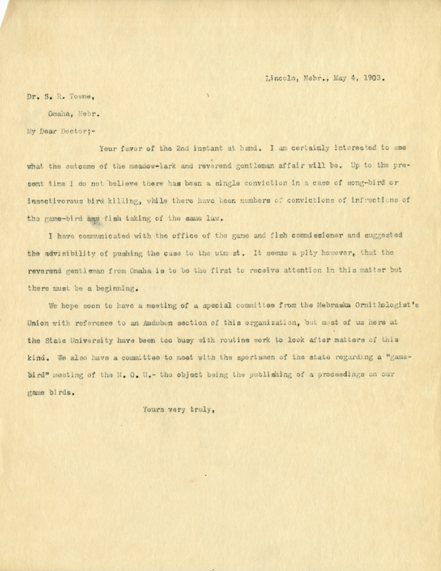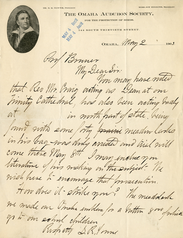 You may have noted that Rev. Mr. Craig acting as Dean at our Trinity Cathedral, has also been acting badly at in north part of state being found with some forty meadowlarks in his bag - was duly arrested and trial will come there May 8th. I may enclose you literature of his making on the subject. We wish here to encourage that prosecution. How does it strike you? The meadowlark we made our Omaha emblem for a letter 8000 of which go to our school children. [Illegible] S. R. Towne