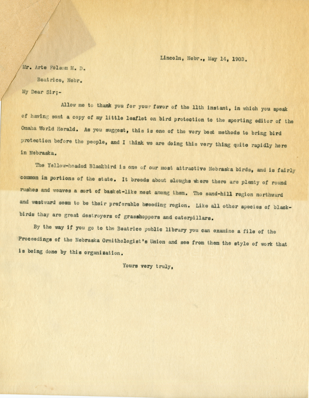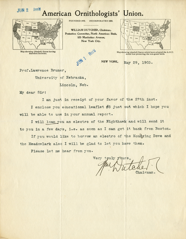 Nebraska Ornithologists’ Union, Letters, 1903, May