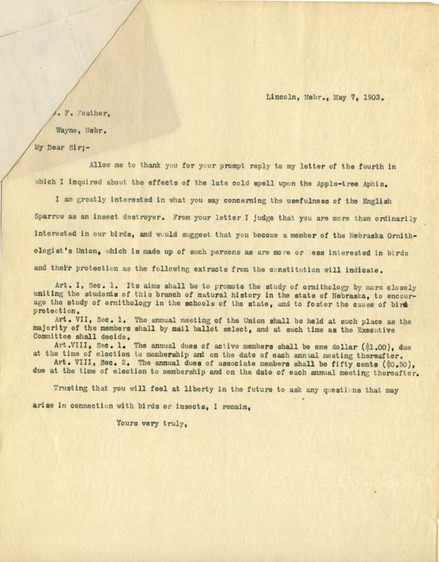 I am greatly interested in what you say concerning the usefulness of the English Sparrow as an insect destroyer, From your letter I judge that you are more than ordinarily interested in our birds, and would suggest that you become a member of the Nebraska Ornithologist's Union, which is made up of such persons as are more or less interested in birds and their protection as the following extracts from the constitution will indicate.