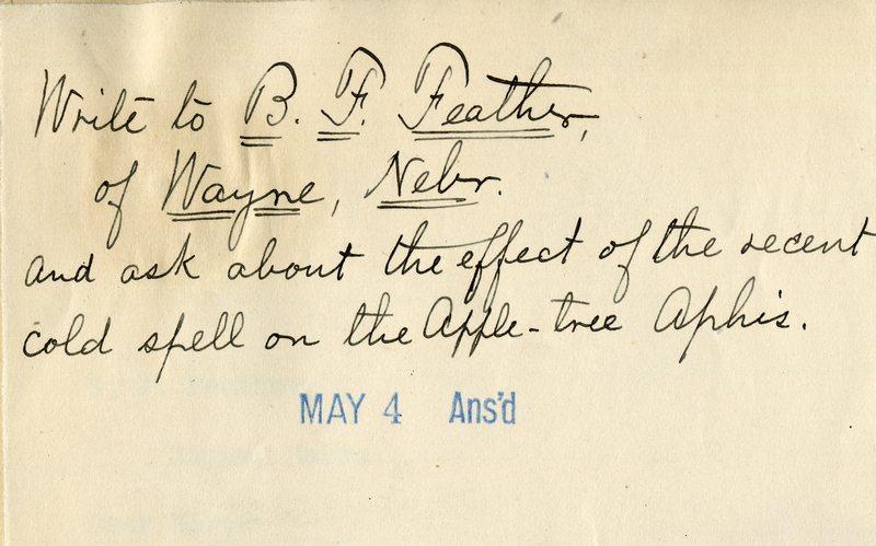 Write to B. F. Feather, of Wayne, Nebr. and ask about the effect of the recent cold spell on the Apple-tree Aphis. May 4 Ans'd