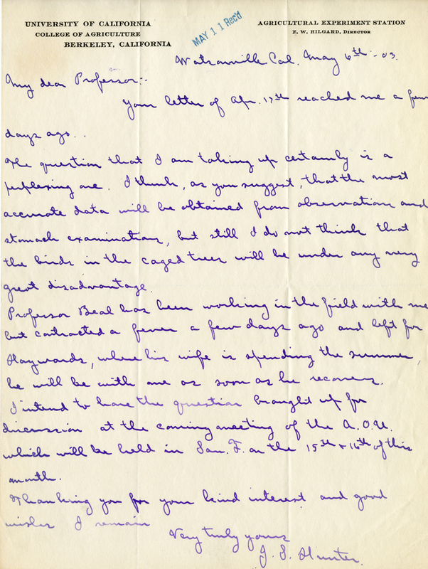 Professor Beal has been working in the field with me but contracted a fever a few days ago and left for Haywards, where his wife is spending the summer, he will be with me as soon as he recovers. I intend to have the question brought up for discussion at the coming meeting of the A. O. U. which will be held in San F. on the 15th & 16th of this month.