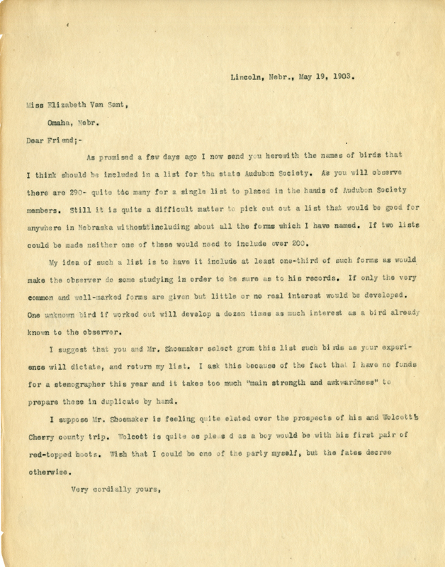 Your letter concerning the check list of Nebraska birds for the use of the Audubon Society has been received and discussed by Wolcott and myself. Owing to the fact that we have so many more species of birds than Massachusetts we have thought it best to prepare separate lists for eastern and western Nebraska. Of course these two lists would necessarily have to include certain common species, but in other respects would differ so as to conform to the regions covered. There should also be a certain number of blanks left for rare birds not listed.