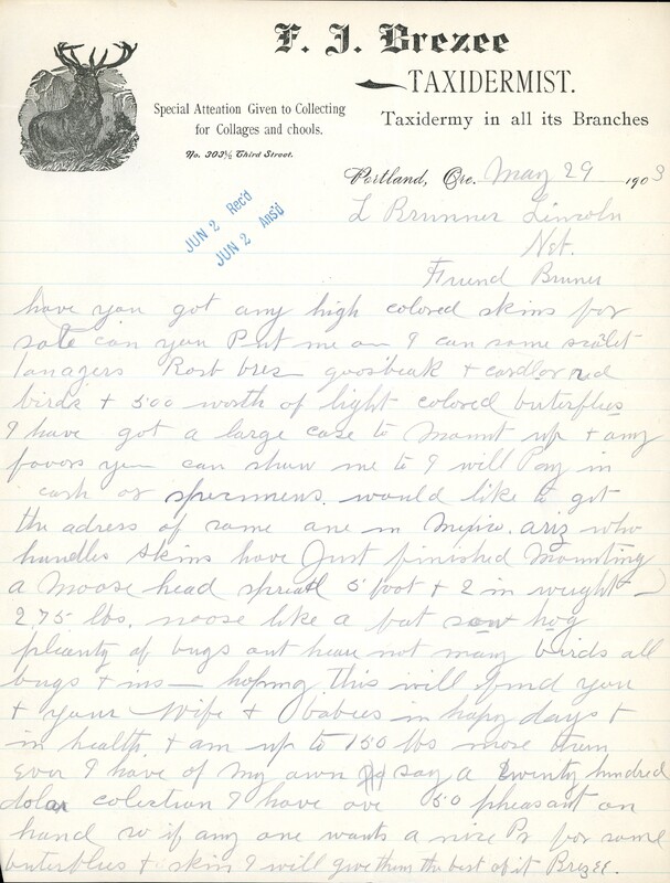 have you got any high colored skins for sale can you Put me on 9 can some scarlet tanagers Rosb bres grosbeak & cardlor red birds & 500 worth of light colored buterflies I have got a large case to mount [illegible] & any favors you can show me to I will Pay in cash or specimens would like to get the adress of some one in Mexico, Ariz who handles skins have Just finished Mounting a Moose head spread 5 foot & 2 in weight 257 lbs. noose like a bat sow hog pleanty of bugs out hear not many birds all bugs & ins___ hoping this will find you & your wife & babies in hapy days & in health & am up to 150 lbs more than ever I have of my own say a twenty hundred dolar colection I have ove 50 pheasant on hand so if any one wants a nice Pr for some buterflies & skin I will give them the best of it Brezee.