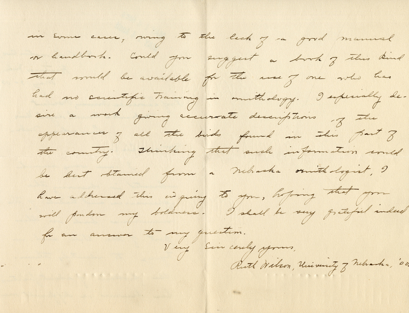 in some cases, owing to the lack of a good manual or handbook. Could you suggest a book of this kind that would be available for the use of one who has had no scientific training in ornithology. I especially desire a work giving accurate descriptions of the appearances of all the birds found in this part of the country. Thinking that such information could be best obtained from a Nebraska ornithologist, I have addressed this inquiry to you, hoping that you will pardon my boldness. I shall be very grateful indeed for an answer to my question. Very sincerely yours,