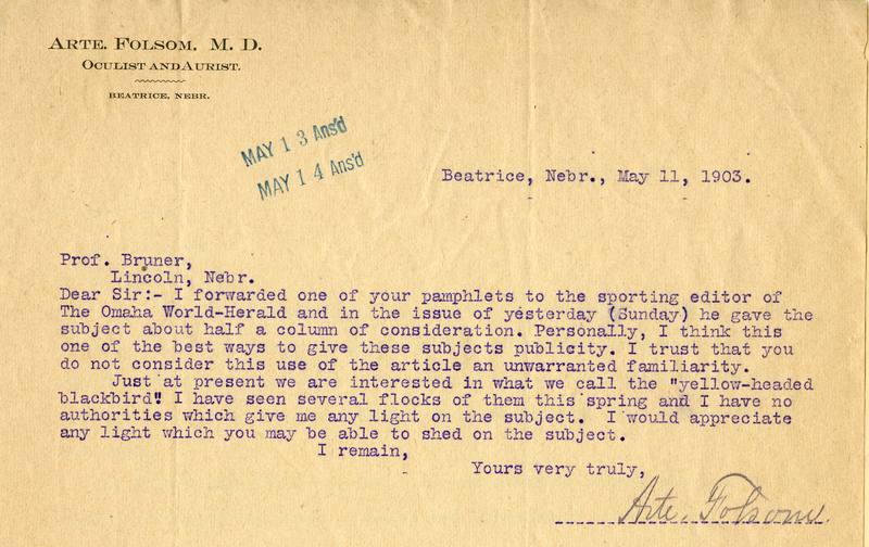 - Letter, Lawrence Bruner to Arte Folsom, 1903, May 14