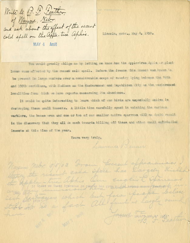 - Letter, Lawrence Bruner to B.F. Feather, 1903, May 4/7