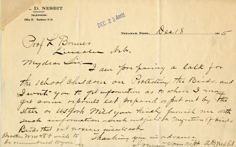 - Letter, A.D. Nesbit to Lawrence Bruner, 1904, Dec. 18