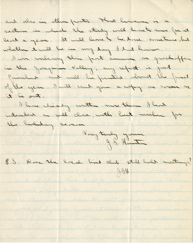 I was working this past summer on grasshoppers in the Joaquin Valley. My report is just finished and will be printed about the first of the year. I will send you a copy as soon as it is out. I have already written more than I had intended so will close, with best wishes for the holiday season.