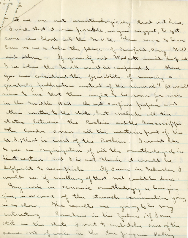 t we are not ornithologicaly dead out here I wish that it were possible, as you suggest, to get some new blood into the N. O. U. There seems to have been no one to take the place of Crawford, Cory, W. H. and others. If yourself and Wolcott would drop out I see where the N. O. U. would be suspended. Have you ever considered the feasibility of running a quarterly publication insead of the annual? It would seem to me that there ought to be room for such in the Middle West. Do not confine papers and other matter to the state, but include all the states between the Rockies and the Mississippi. The Condor covers all the western part of the U.S.; that is west of the Rockies. I would like to see an organization of all the ornithologists in that section and I do not think it would be difficult to accomplish. If I were in Nebraska I would see if something of that sort could be done. My work in economic ornithology is hanging fine, on account of the stomach examinations going on so slow. The results are going to be very interesting. Sometime in the future, if I am still in the state I want to undertake some of the same sort of work in the San Joaquin Valley