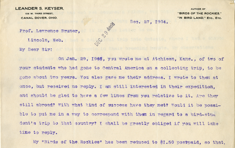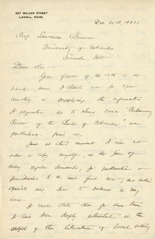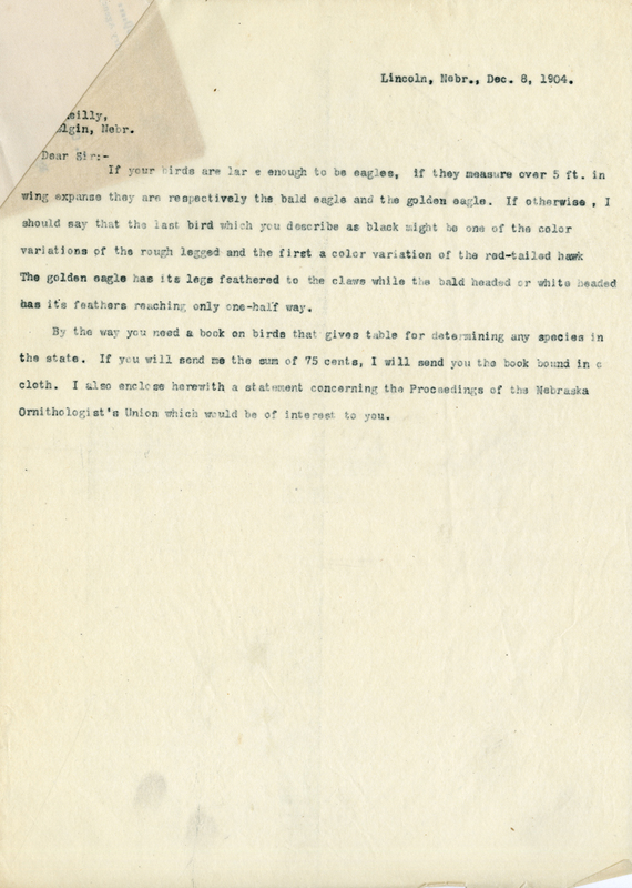 Nebraska Ornithologists’ Union, Letters, 1904, December