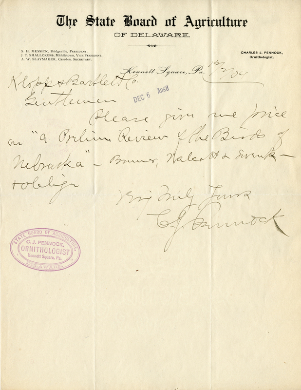 State Board of Agriculture C. J. Pennock ORNITHOLOGIST Kennett Square, Pa. Delaware