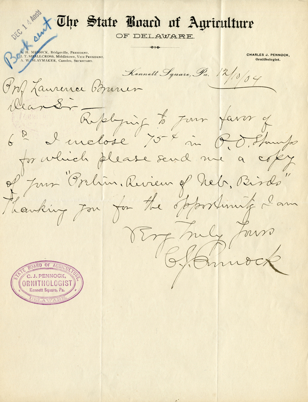 - Letter, Charles J. Pennock to Lawrence Bruner, 1904, Dec. 10