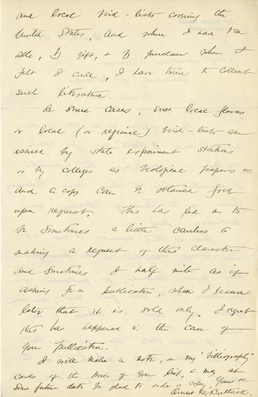 In some cases, such local floras or local (or regional) bird-lists are issued by state experiment stations or by colleges as biological papers &c and a copy can be obtained free upon request. This has led me to be sometimes a little cautious a making a request of this character and sometimes I half [illegible] as if asking for a publication, when I learn later that it is sold only. I regret this has happened in the case of your publication.