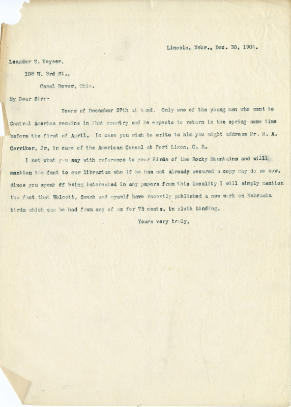 I note what you say with reference to your Birds of the Rocky Mountains and will mention the fact to our librarian who if he has not already secured a copy he may do so now. Since you speak of being interested in any papers from this locality I will simply mention the fact that Wolcott, Swenk and myself have recently published a new work on Nebraska birds which can be had from any of us for 75 cents. in cloth binding.