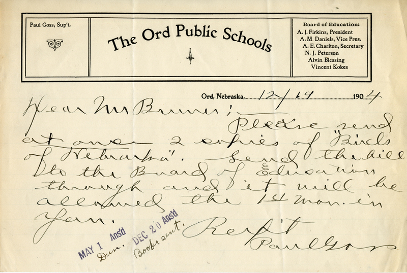 Please send at once 2 copies of "Birds of Nebraska". Send the bill to the Board of Education through and it will be allowed the 1st Mon. in Jan.