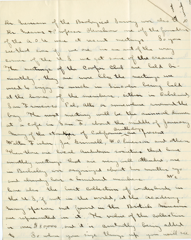 Walter Fisher, Joe Grinnell, W. O. Emerson and others. Then there are local Audubon societies that have monthly meetings that are very well attended, one in Berkeley was organized about two months ago and already has a hundred members. We have also the best collection of water birds in the U.S. if not in the world, at the Academy. Many species not found in the British Museum are represented in it. The value of the collection is over $50,000, and it is constantly being added to So when you size things up you will see