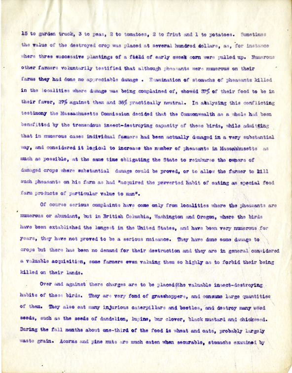In 1914 the Massachusetts Commission reported that during 1912 and 1913 numerous complaints had been made to it of damage to farm crops by wild pheasants. Of 44 formal complaints lodged in that office in those years, 21 related to damage to corn,