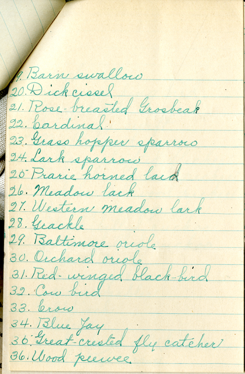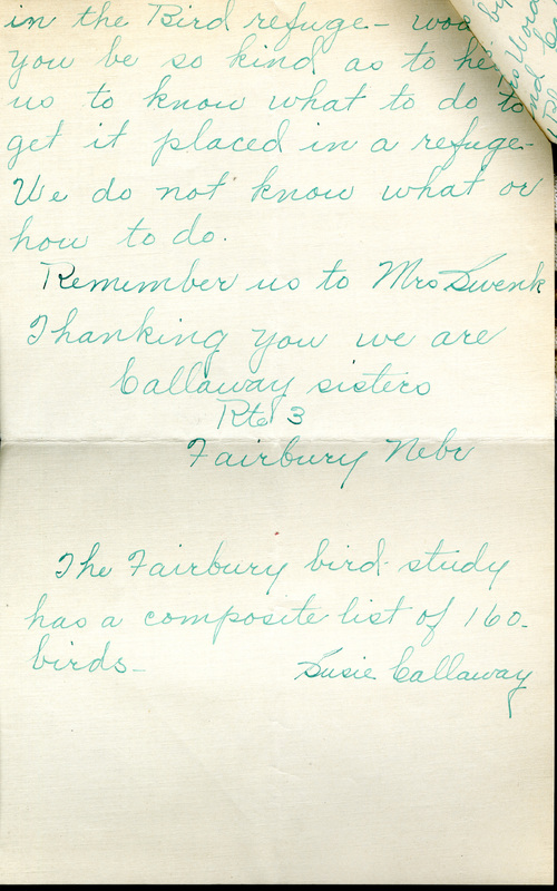 Many thanks for your letter of June 20 giving the list of birds which you and your sisters with Mrs.Hole, Miss Holly, Mrs. Worden and Mrs. Richardson, identified last Wednesday morning between 7 and 11:30 a. m. Fifty-seven birds at this time, when the nesting season is fully on, is very good. It would be interesting to establish the Kentucky warbler as a breeding bird at Fairbury, for we do not have any record of its nesting as far away from the Missouri River and there are some excellent places for it at Fairbury. I had hoped to get down to see your white-eyed vireo, but it will not be possible this spring, I fear. You do not include it in your list; is it still present with you? I note what you say concerning your thought of joining with the Richardsons in having your farm placed in the bird refuge, and your inquiry as to what to do to get it placed in a refuge. There are refuges under two authorities - Federal and State. The Federal refuges are usually large bodies of public land such as, in this state, the Nebraska National Forest near Halsey and the Niobrara Reservation near Valentine. I do not myself know the details of establishing a Federal bird refuge, but I believe it is a complicated matter and requires Presidential action. The Bureau of Biological Survey, U. S. Department of Agriculture, could give you information on that point if you care to write them. The small bird refuges in Nebraska are established under the State law passed in 1921. I will quote for you the sections in the law relating to State game and bird serves: