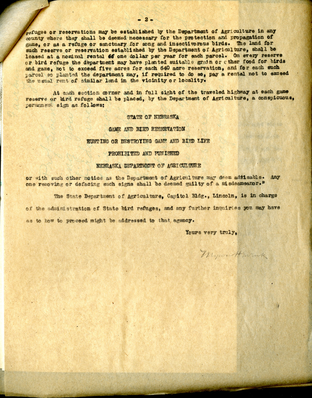 " The State Department of Agriculture, Capitol Bldg., Lincoln, is in charge of the administration of Sate bird refuges, and any further inquiries you may have as to how to proceed might be addressed to that agency.