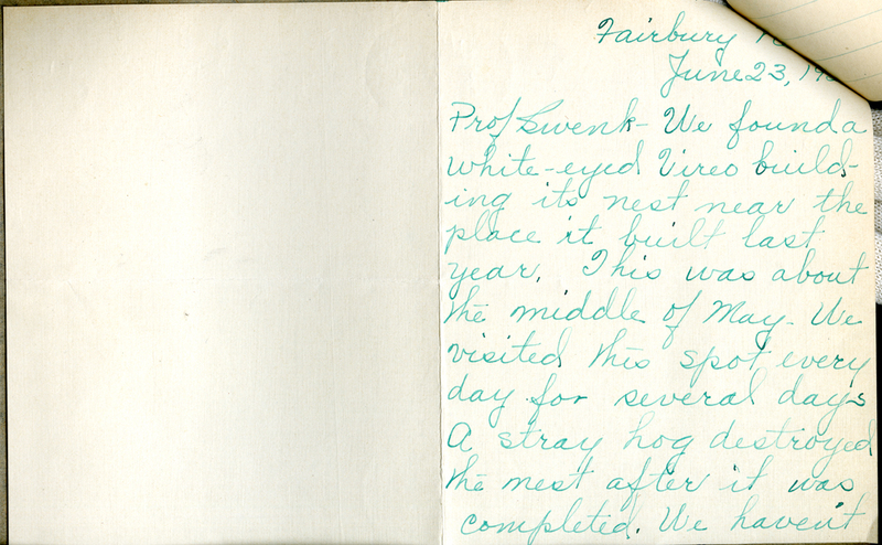 Thank you for the information regarding the nesting of the white-eyed vireo at Fairbury this year. If you succeed in locating its nest either this year or next year I would appreciate your letting me know about it so that, if possible, I can see it. This bird is as a rule so closely confined to the Missouri river region that its nesting as far away as Fairbury is something or a record.