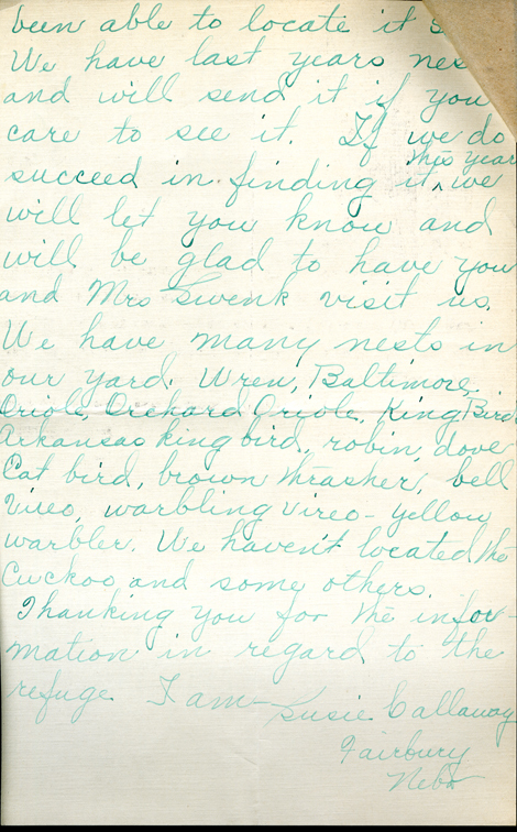 been able to locate it We have last years nest and will send it if you care to see it. If we do succeed in finding it this year we will let you know and will be glad to have you and Mrs. Swenk visit us. We have many nests in our yard. Wren, Baltimore Oriole, Orchard Oriole, King Bird, Arkansas king bird, robin, dove, Cat bird, brown thrasher, bell Viero, warbling vireo - yellow warbler. We haven't located the Cuckoo and some others.