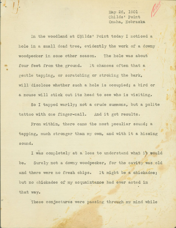 In the woodland at Childs' Point today I noticed a hole in a small dead tree, evidently the work of a downy woodpecker in some other season. The hole was about four feet from the ground. It chances often that a gentle tapping, or scratching or stroking the bark, will disclose whether such a hole is occupied; a bird or a moue will stick out its head to see who is visiting.