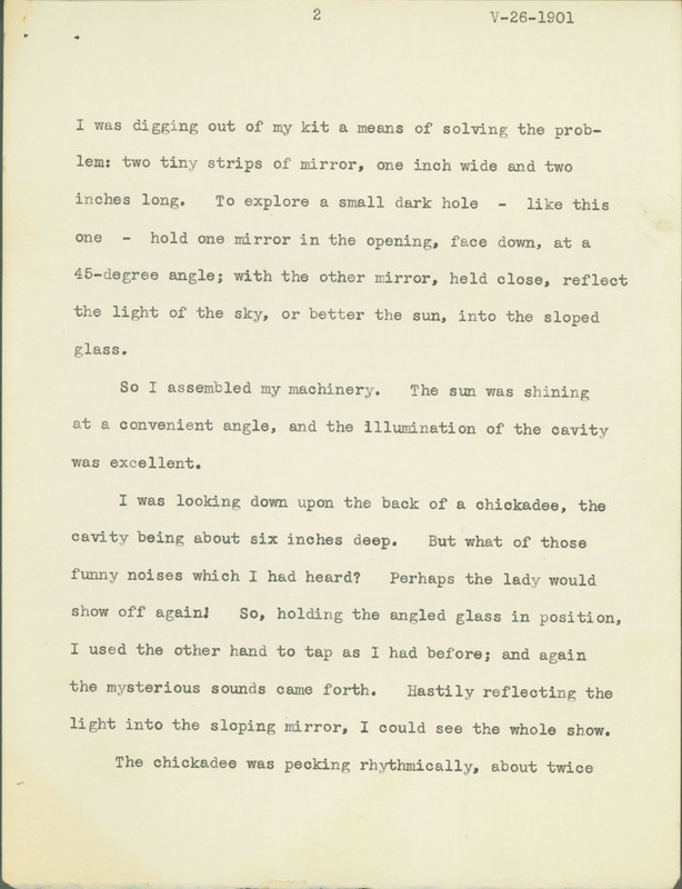 I was looking down upon the back of a chickadee, the cavity being about six inches deep. But what of those funny noises which I had heard? Perhaps the lady would show off again! So, holding the angled glass in position, I used the other hand to tap as I had before; and again the mysterious sounds came forth. Hastily reflecting the light into the sloping mirror, I could see the whole show.