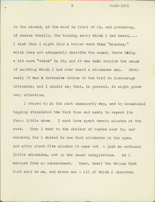 to the second, at the wood in front of it, end producing, of course vocally, the hissing sound which I had heard.... I wish that I might find a better word than "hissing," which does not adequately describe the sound, there being a bit more "voice" in it; and it was well outside the range of anything which I had ever heard a chickadee say. Obvi-ously it was a defensive device of the bird to discourage intrusion; and I should say that, in general, it might prove very effective.