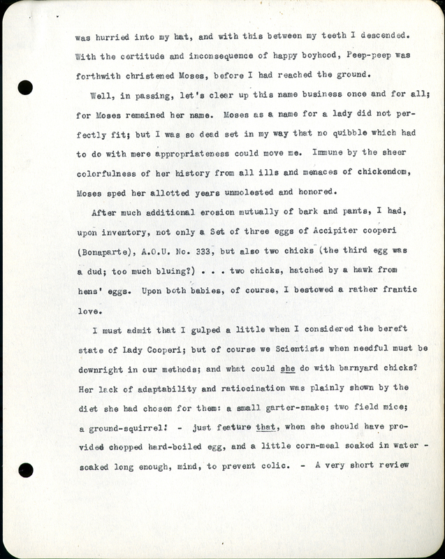 After much additional erosion mutually of bark and pants, I had, upon inventory, not only a Set of three eggs of Accipiter cooperi(Bonaparte), A.O.U. No. 333, but also two chicks (the third egg was a dud; too much bluing?) . . . two chicks, hatched by a hawk from hens’ eggs. Upon both babies, of course, I bestowed a rather frantic love.